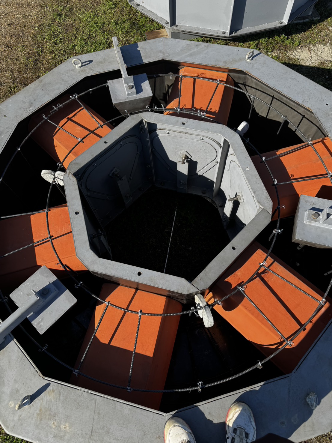 オレンジ色の中子(なかご)を固定し、鉄筋をバランスよく結束していくことで、後のコンクリート打設に備えます。