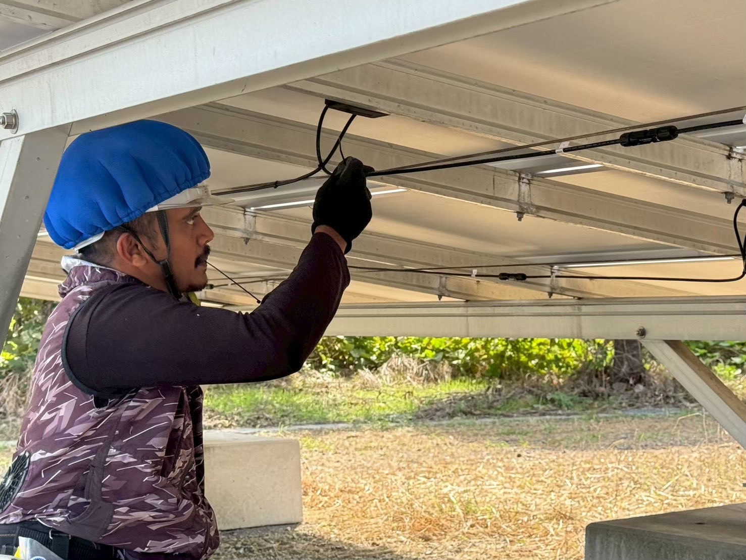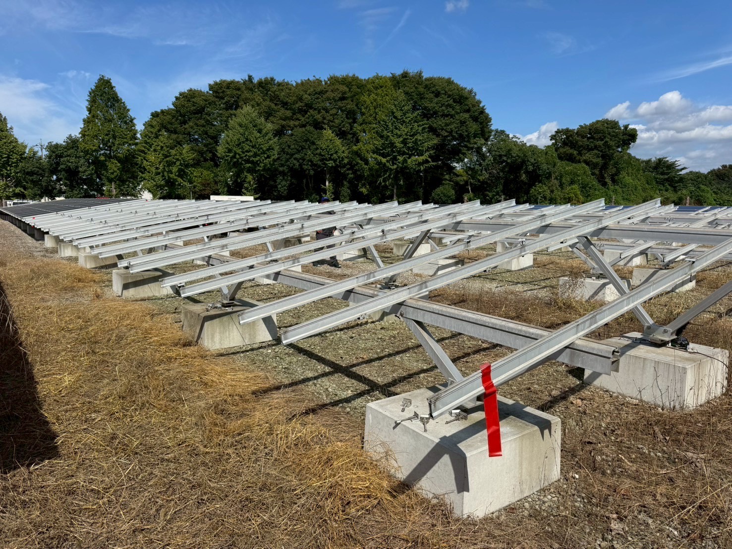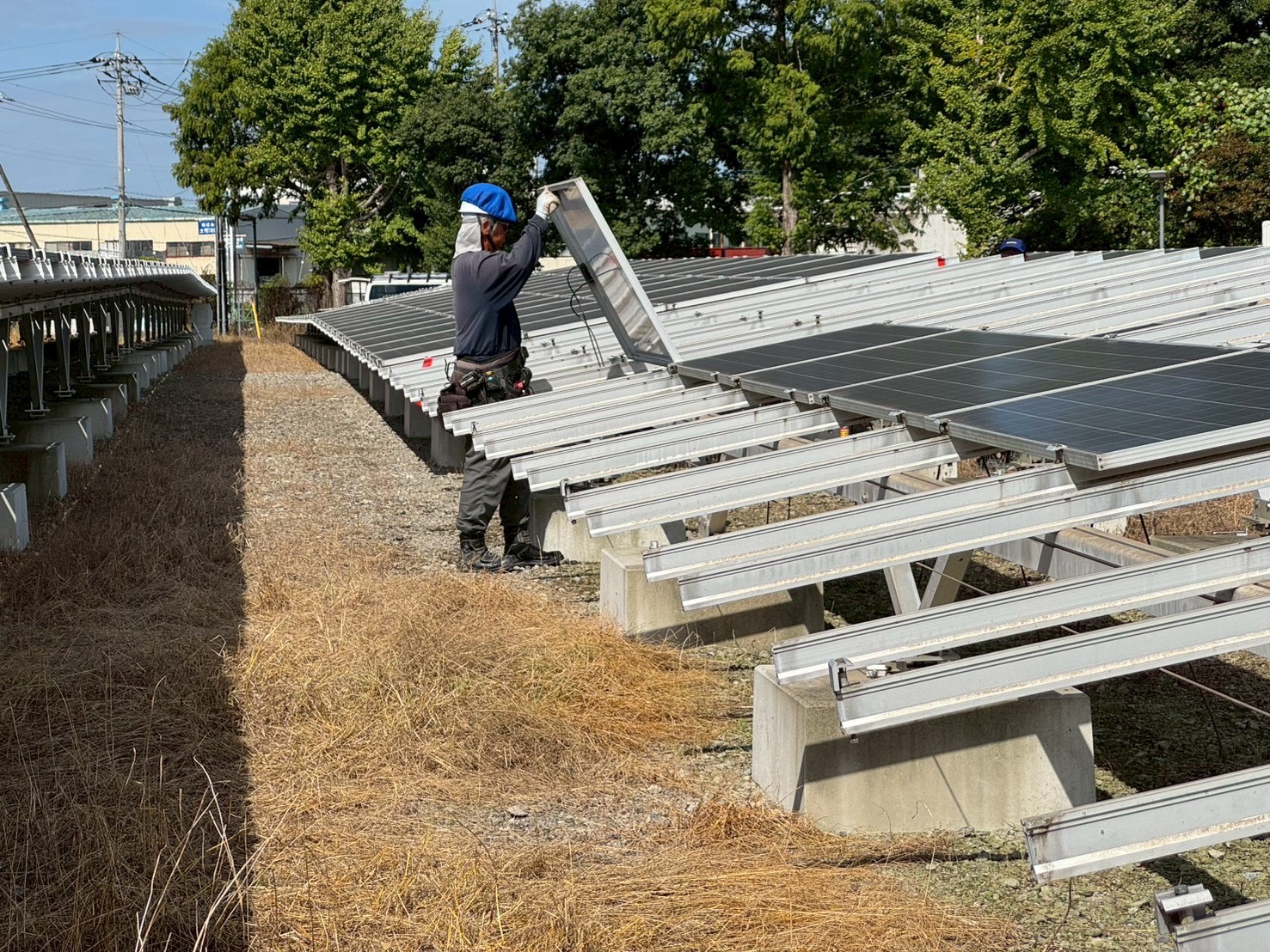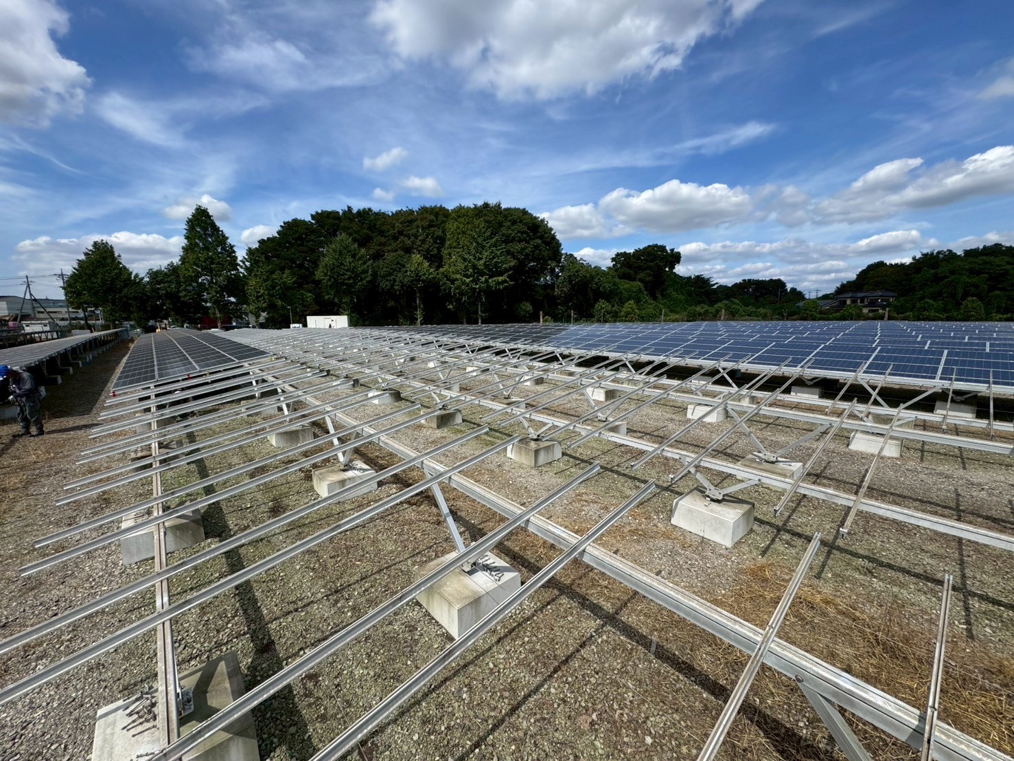 9月はまだ日差しも強く、現場は広い敷地いっぱいに架台が並び、
