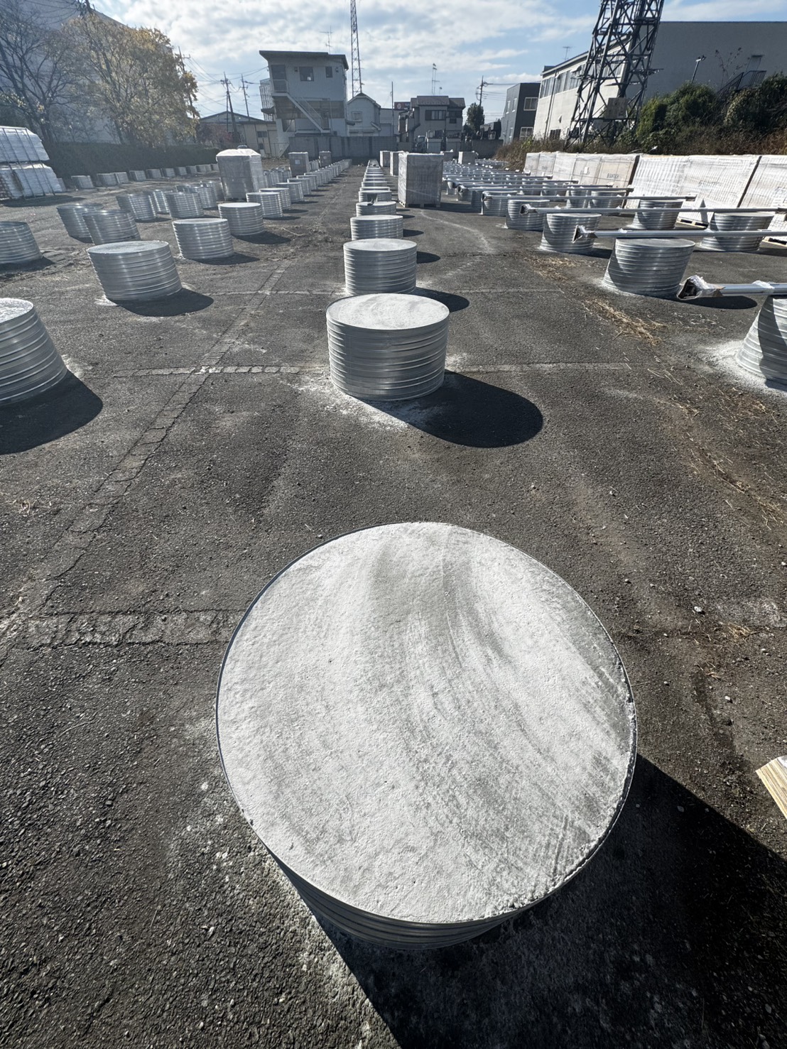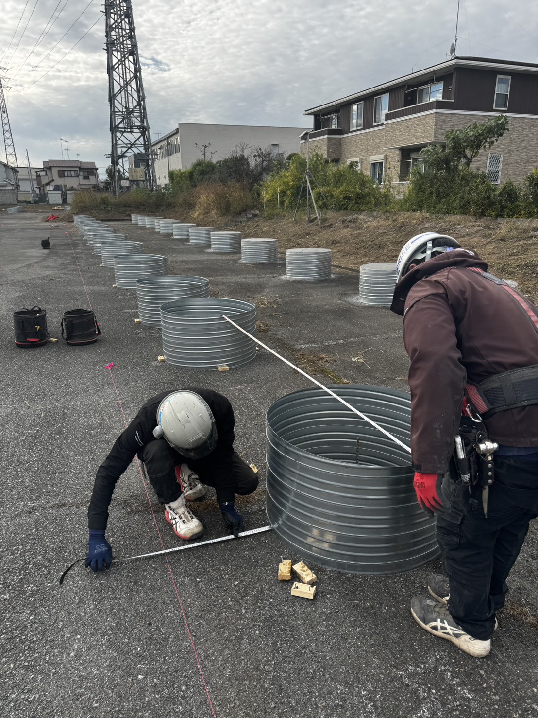 太陽光発電設備において、基礎工事は設備全体の安定性を左右する重要な工程です。本現場では、位置出し・レベル調整を細かく行いながら、円形基礎を一基一基確実に施工しています。