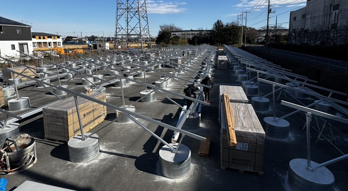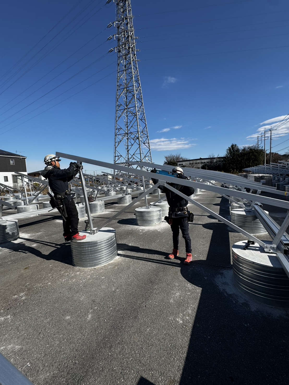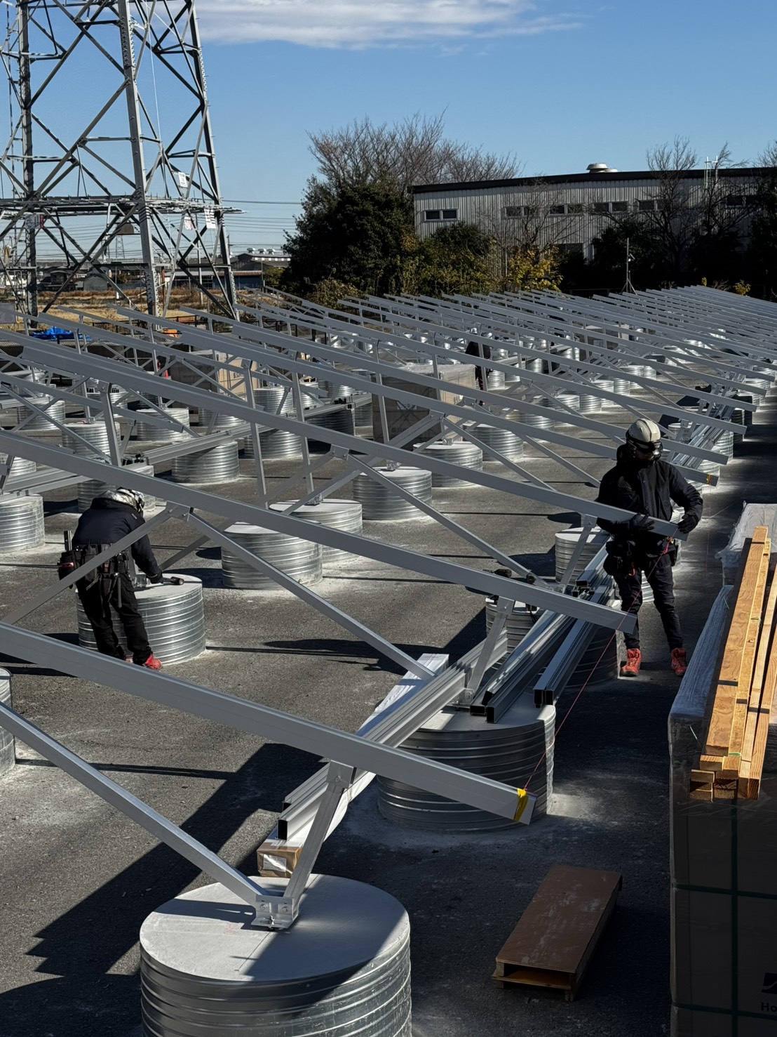 基礎工事完了後は、太陽光パネルを支える架台の設置作業へと移行。多数の基礎が整然と並ぶ中、部材の搬入・組立・固定を計画通り進めています。